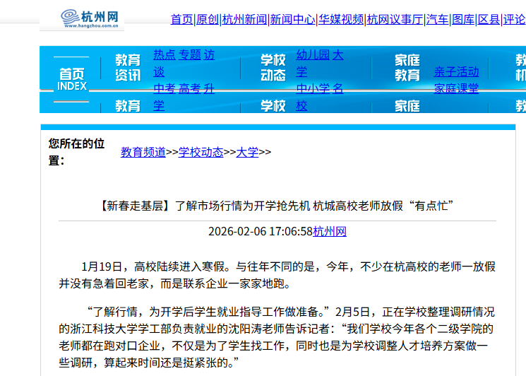 1月19日,高校陸續(xù)進(jìn)入寒假。與往年不同的是,今年,不少在杭高校的老師一放假并沒(méi)有急著回老家,而是聯(lián)系企業(yè)一家家地跑。“了解行情,為開(kāi)學(xué)后學(xué)生就業(yè)指導(dǎo)工作做準(zhǔn)備。”2月5日,正在學(xué)校整理調(diào)研情況的浙江科...