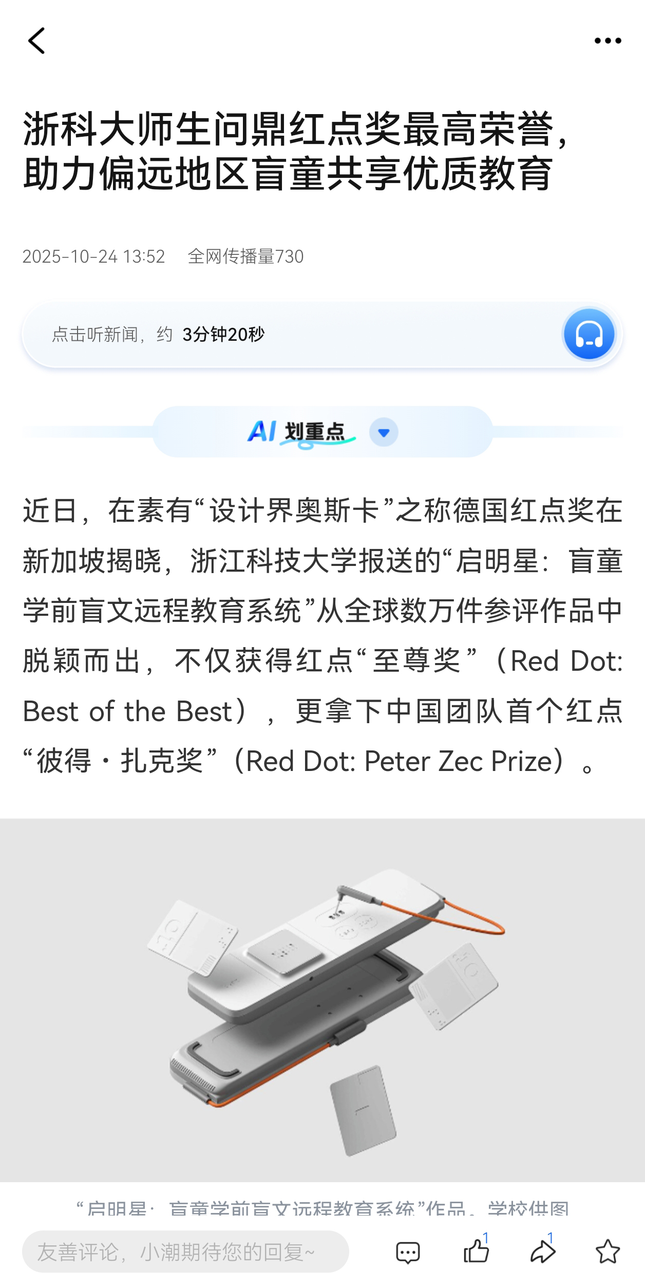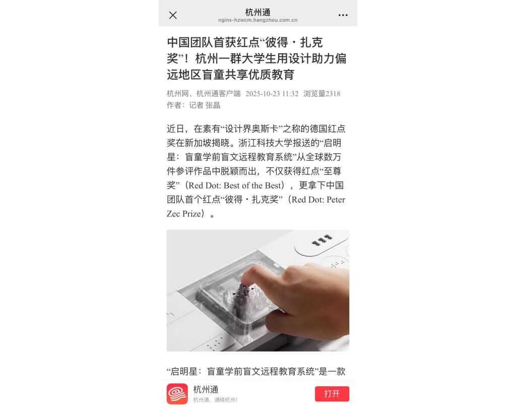 近日,素有“設(shè)計(jì)界奧斯卡”之稱的德國紅點(diǎn)獎(jiǎng)在新加坡揭曉。浙江科技大學(xué)報(bào)送的“啟明星:盲童學(xué)前盲文遠(yuǎn)程教育系統(tǒng)”從全球數(shù)萬件參評(píng)作品中脫穎而出,不僅獲得紅點(diǎn)“至尊獎(jiǎng)”(Red Dot: Best of the Best),更拿下中國團(tuán)隊(duì)首個(gè)紅點(diǎn)“彼得?扎克獎(jiǎng)”(Red Dot: Peter Zec Prize)。