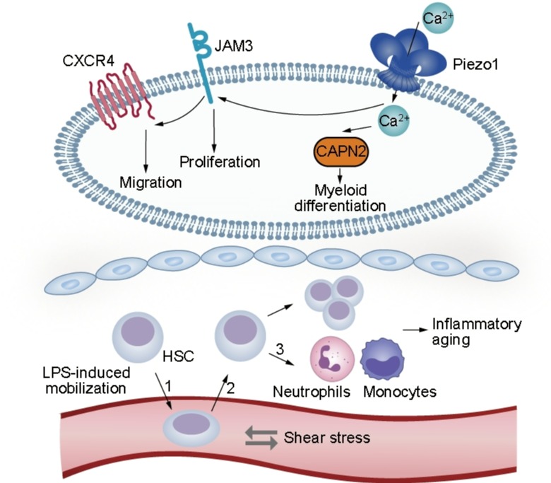 該研究聚焦于力學(xué)——生物學(xué)交叉前沿,探索力學(xué)環(huán)境對(duì)造血干細(xì)胞命運(yùn)的調(diào)控機(jī)制。造血干細(xì)胞通常靜息于骨髓中,在低氧、炎癥或細(xì)胞因子刺激下可被動(dòng)員進(jìn)入外周血,并暴露于血流剪切力環(huán)境中。然而,機(jī)械刺激如何調(diào)控造血干細(xì)胞(HSC)的命運(yùn)尚未明晰。在本研究中,趙莉副教授憑借在智能材料與多場耦合力學(xué)分析研究領(lǐng)域的理論積累與分析方法專長,為揭示機(jī)械力信號(hào)影響干細(xì)胞行為的定量規(guī)律提供了重要支持。研究表明,機(jī)械敏感離子通道Piezo1能夠感知血流剪切應(yīng)力,進(jìn)而通過Jam3-Capn2信號(hào)通路驅(qū)動(dòng)HSC增殖與髓系分化,促進(jìn)炎癥誘導(dǎo)的衰老過程(上圖)。研究同時(shí)發(fā)現(xiàn),應(yīng)用Piezo1拮抗劑GsMTx4可有效抑制HSC過度活化,從而減緩相關(guān)衰老表型。